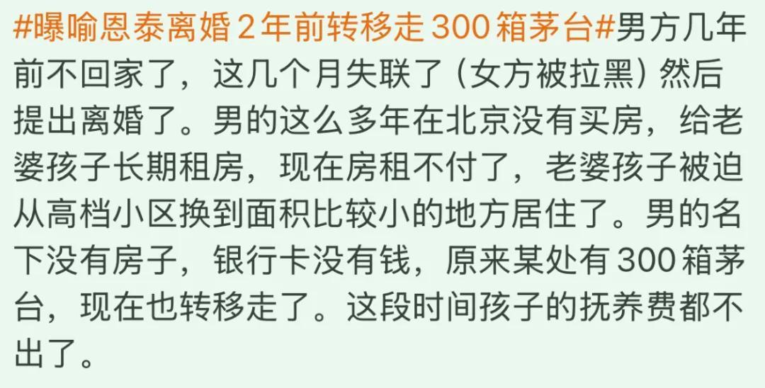 據爆料,2022 年後他們正式分居,喻恩泰徹底不顧這個家,不僅對妻女不管不顧,還悄悄轉移了所有財產。