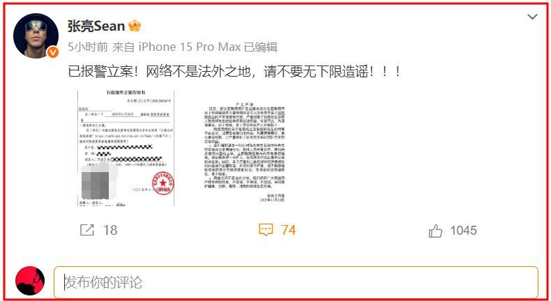11月26日下午,張亮發文“已報警立案!網絡不是法外之地,請不要無下限造謠!!!”並配上了2張圖片。