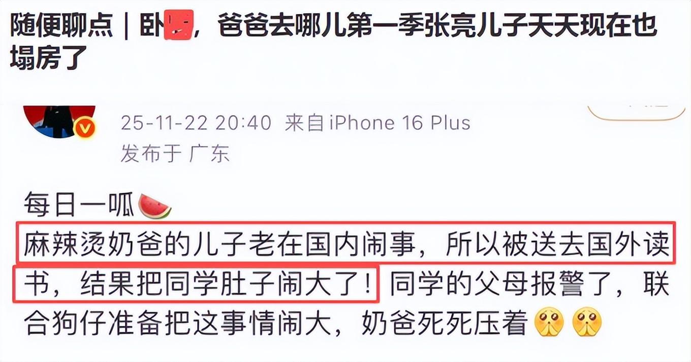 一位娛樂博主以麻辣燙奶爸代指張亮。該博主說張亮的兒子經常在國內鬧事,所以他被送往國外讀書。