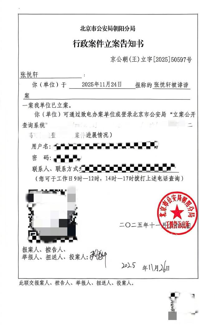 第一張圖片是警方的立案告知書。從該告知書上可知,天天以被誹謗爲由親自前往派出所報案了,並已立案。
