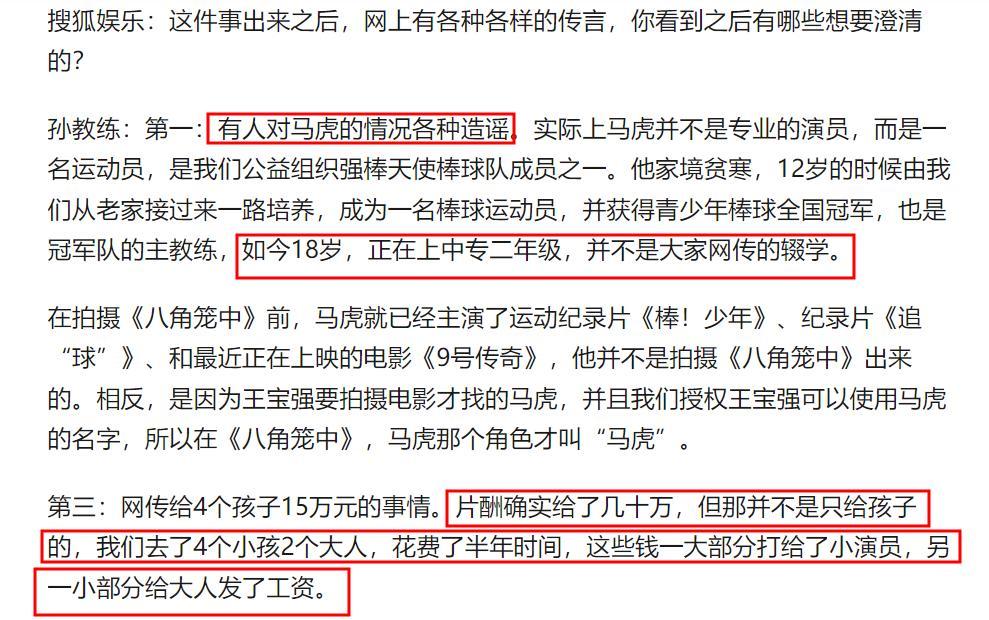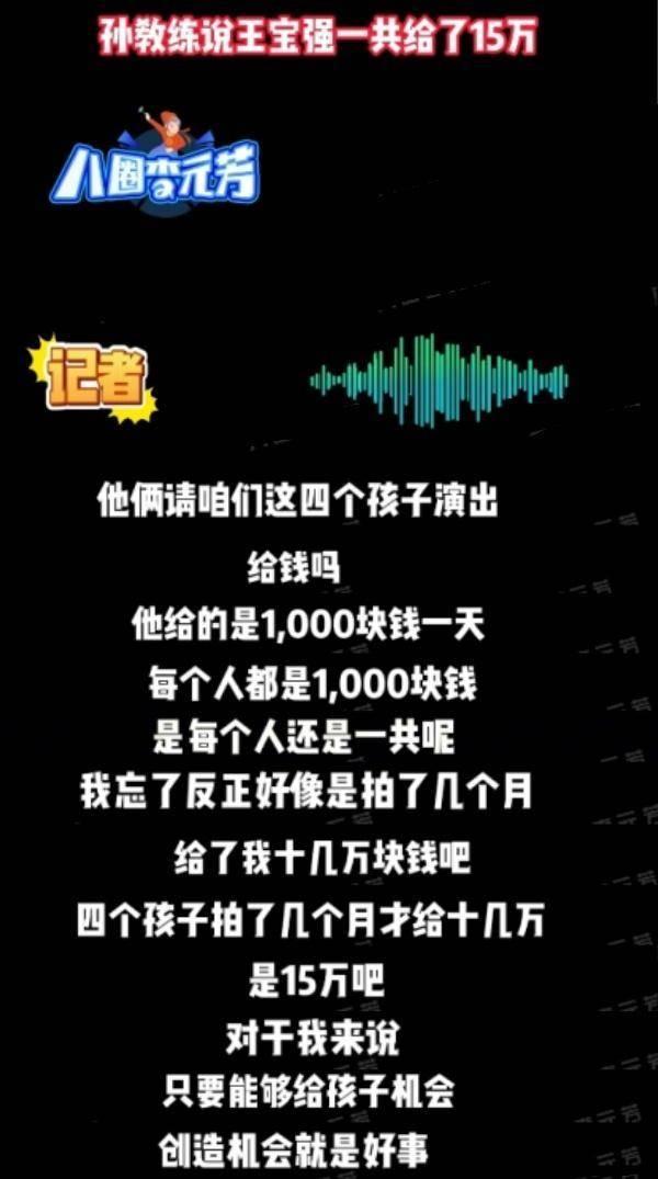 從狗仔放出的與幾位小演員的教練孫教練的聊天錄音中可知,孫教練說王寶強對外宣稱資助小演員是吹牛。而且該錄音中還提到,4位小演員拍戲3個月,王寶強給了他們15萬。