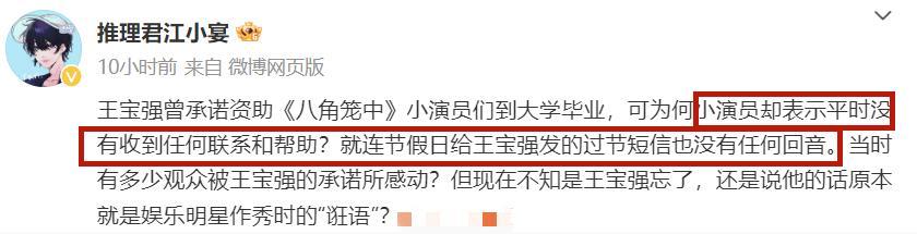 彼時有狗仔爆料稱王寶強曾承諾資助拍攝《八角籠中》的小演員上學,但沒有兌現承諾。