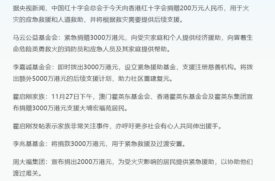 香港霍家第一時間就捐贈了3000萬港元支援宏福苑居民。