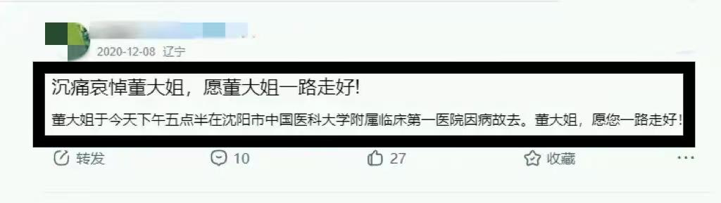 在網絡查詢還可以發現,在2020年12月8日,就有網友在網上發帖稱董立範在瀋陽的某家醫院病逝。一個月後,該網友再次發帖稱董立範疑似因心腦血管方面的疾病離世。