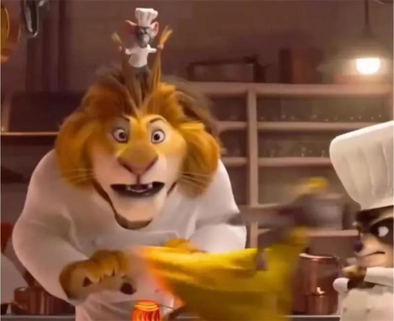 結果獅子頭上藏着一隻老鼠,毫無疑問這個橋段致敬了動畫《料理鼠王》。