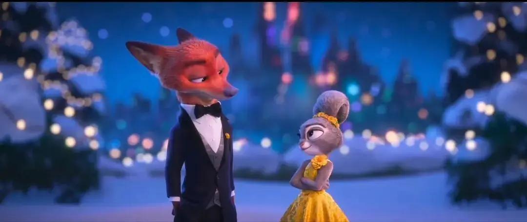 盛大的宴會中,兔朱迪與狐尼克身着禮服的精緻造型,就是對《美女與野獸》中主角舞會裝扮的“神還原”。