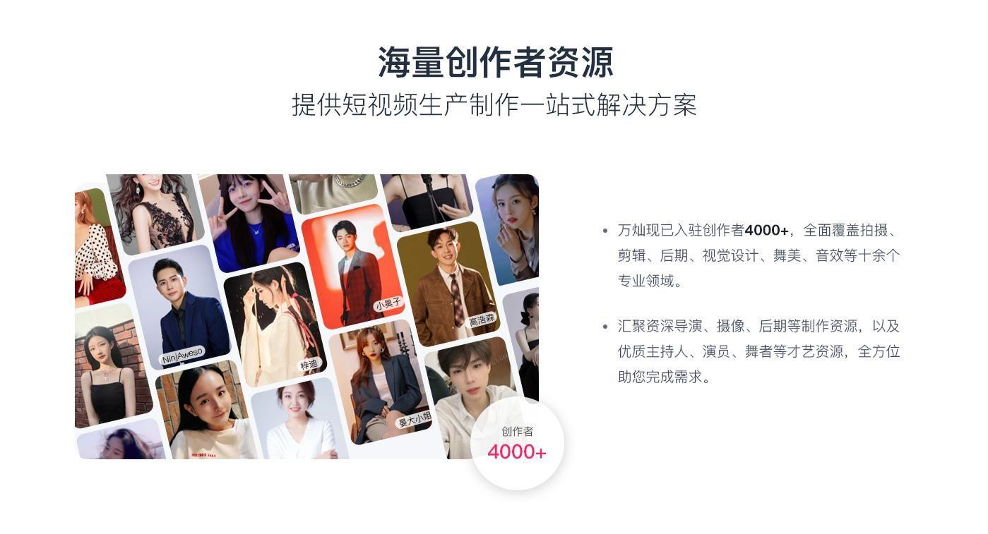 萬燦平臺將內容創作者以製作能力/才藝能力兩個類別進行劃分,製作能力涵蓋導演/製作人、攝影攝像、後期剪輯、視覺設計、現場燈光、化妝造型等短視頻製作要素生產者,才藝能力包括了主持人、演員、配音、歌手、模特等才藝能力者,可提供爆款內容創作、品牌直播、代運營、品牌設計整包等短視頻內容生產一站式服務。