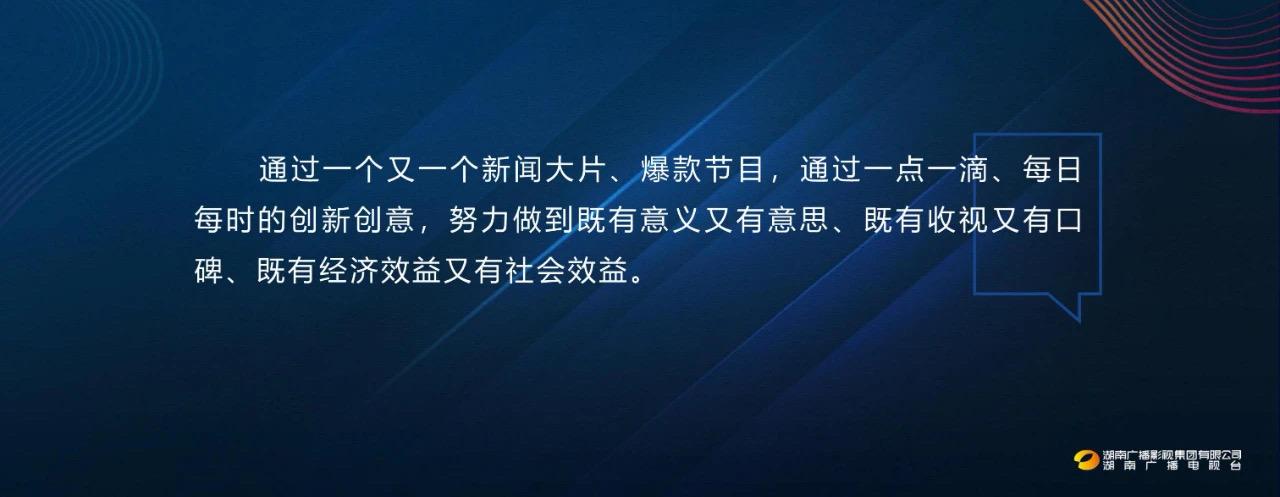 心有所向,行者無疆;責任永無止境,追求不能懈怠。習近平總書記在考察馬欄山視頻文創園時強調:“文化產業既有意識形態屬性,又有市場屬性,但意識形態屬性是本質屬性。”做鐫刻於時代、影響於人心、奉獻於社會的主流大臺和新型主流媒體集團,是湖南廣電的歷史使命。要更好地做到這一點,芒果人前面的路還很長,還需要做很多改進。我們將更深入地學習領會習近平新時代中國特色社會主義思想,更積極地呼應主管部門的要求,更真誠地聆聽社會大衆的聲音,更虛心地學習各位同行的經驗,讓湖南廣電的責任之路越走越堅實,越走越寬廣。