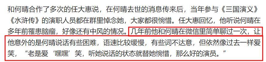 98版《水滸傳》總製片人任大惠透露,幾年前他和何晴在微信上聊過一次天。彼時讓他感到意外的是何晴說話有些困難,語速比較緩慢,甚至有些詞不達意。