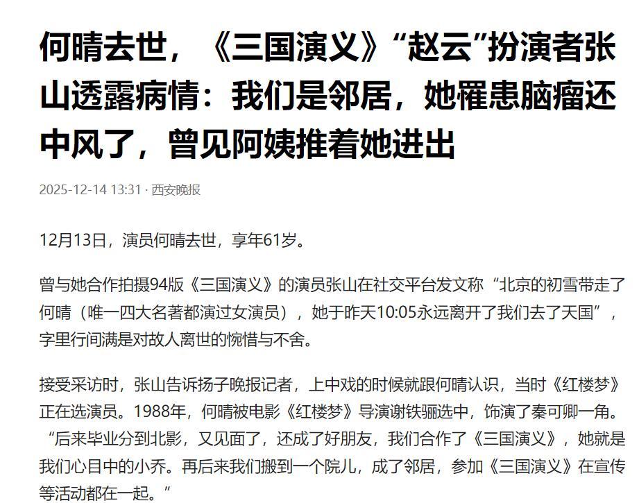 12月14日,有“古典第一美女”美譽的著名女星何晴被曝去世。