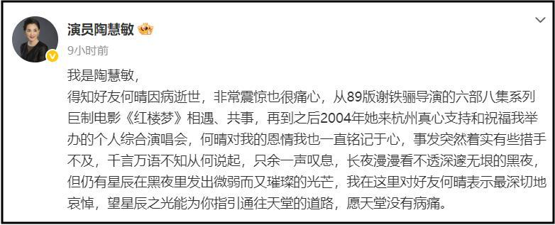 在何晴離世後,六小齡童、陶慧敏、張紀中等人紛紛發文悼念。