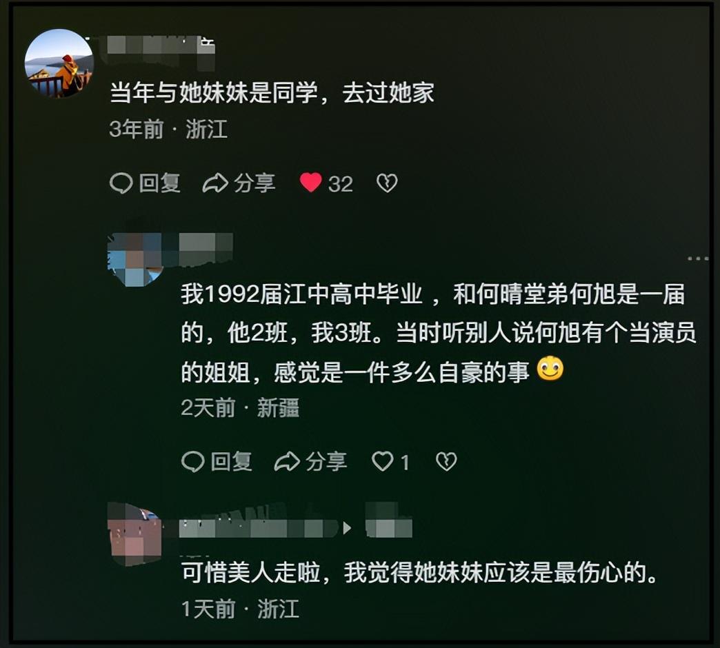 值得一提的是,何晴不是獨生子女,評論區有當地網友透露何晴有一個妹妹,名叫何暢。