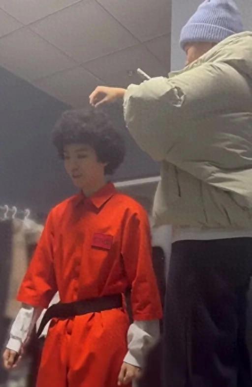畫面中,她俏皮地拎着王俊凱的爆炸頭假髮,王俊凱則默契配合弓背屈膝原地踏步。