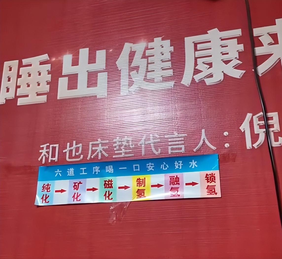 在《百姓315》曝光和也富氫水的視頻中還可以看到,在涉事店面的牆壁上,掛有倪萍代言和也牀墊的巨型廣告。