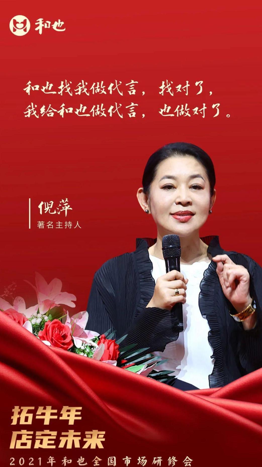在2021年的和也活動上,更能看出倪萍對和也的推崇,彼時她在活動上直言“我慶幸認識了和也,是和也的健康理念拽着我走。和也這些年的變化也特別大,我覺得和也找我來做代言找對了,我給和也做代言,也做對了。”