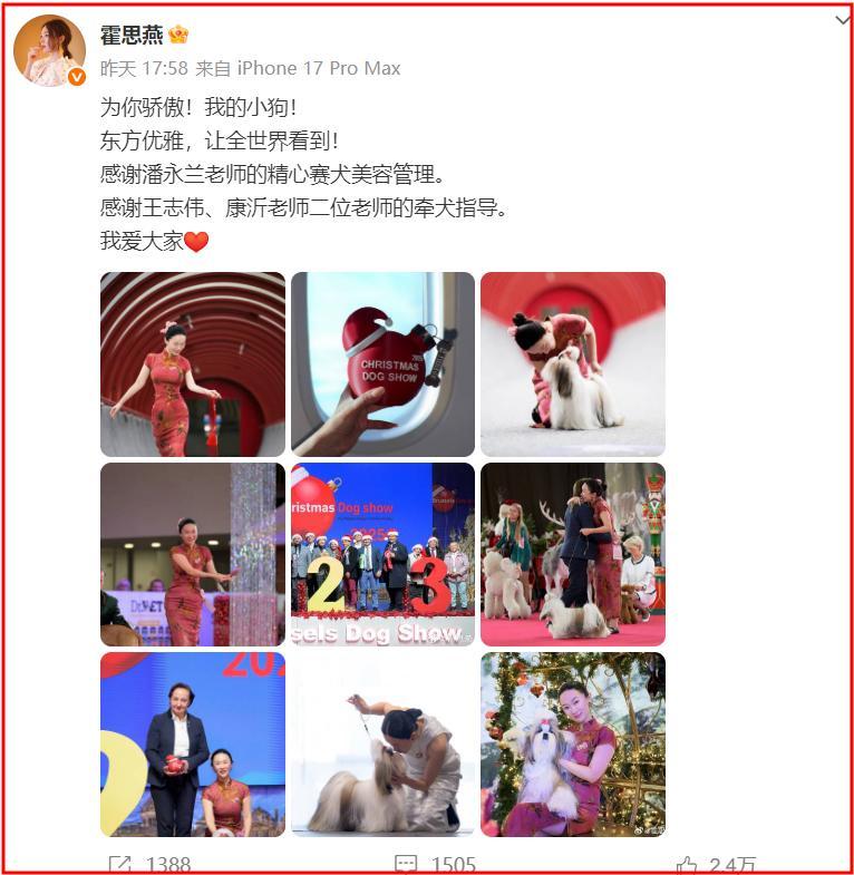 誰能想到曾經被質疑立愛狗人設的霍思燕,不僅將狗狗們養得特別好,還能帶着愛犬走上國際賽場,拿下冠軍大獎。