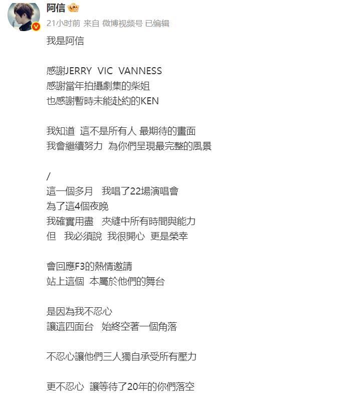 到了12月23日上午,阿信以文字的形式將自己的想法和感觸再說了一遍。