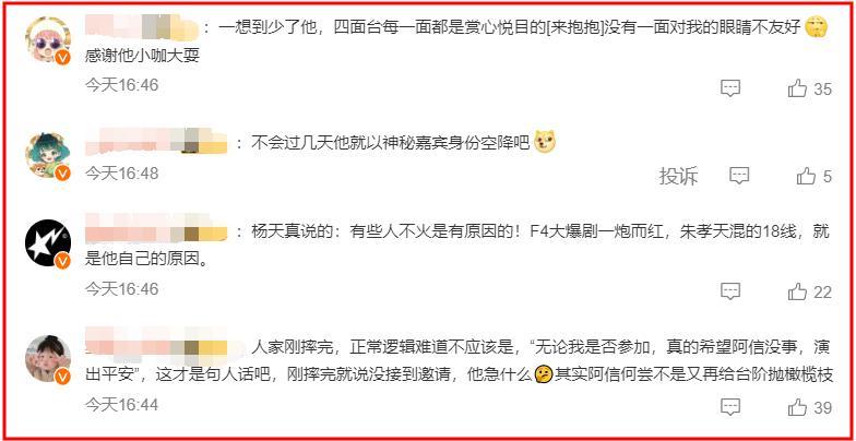 還有網友說“人家剛摔完,正常邏輯難道不應該是,‘無論我是否參加,真的希望阿信沒事,演出平安’,這纔是句人話吧,剛摔完就說沒接到邀請,他急什麼,其實阿信何嘗不是又再給臺階拋橄欖枝。”