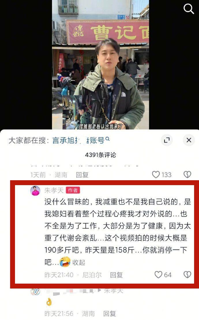 結果沒多久,朱孝天就打臉韓雯雯,他說自己減肥30斤不全是爲了工作,“大部分爲了健康,因爲太重了代謝會紊亂”。