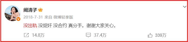 面對網絡上越來越離譜的猜測,闞清子發文做出了回應,她寫道:沒出軌、沒捉姦、沒合約,真分手,謝謝大家關心。