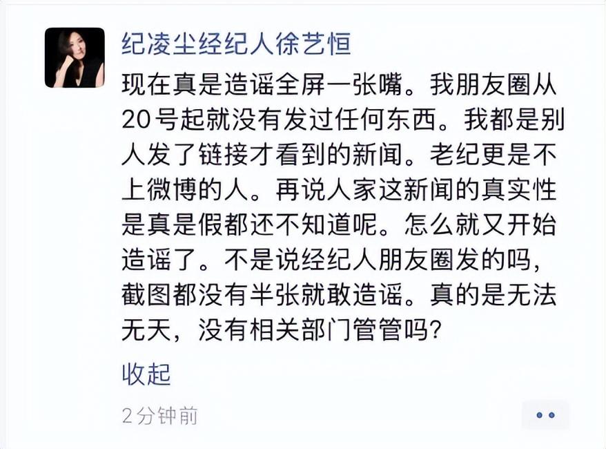 面對這種情況,紀凌塵經紀人闢謠了,她無奈地說“現在真是造謠全屏一張嘴。我朋友圈從20號起就沒有發過任何東西。我都是別人發了鏈接纔看到的新聞。”