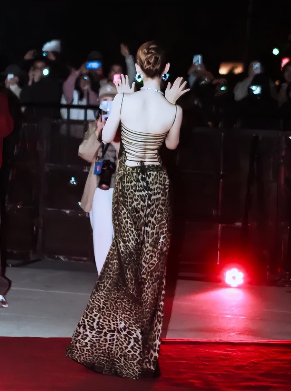芭莎之夜一襲吊帶豹紋禮服亮相,更是直接把性感路線走到極致。
