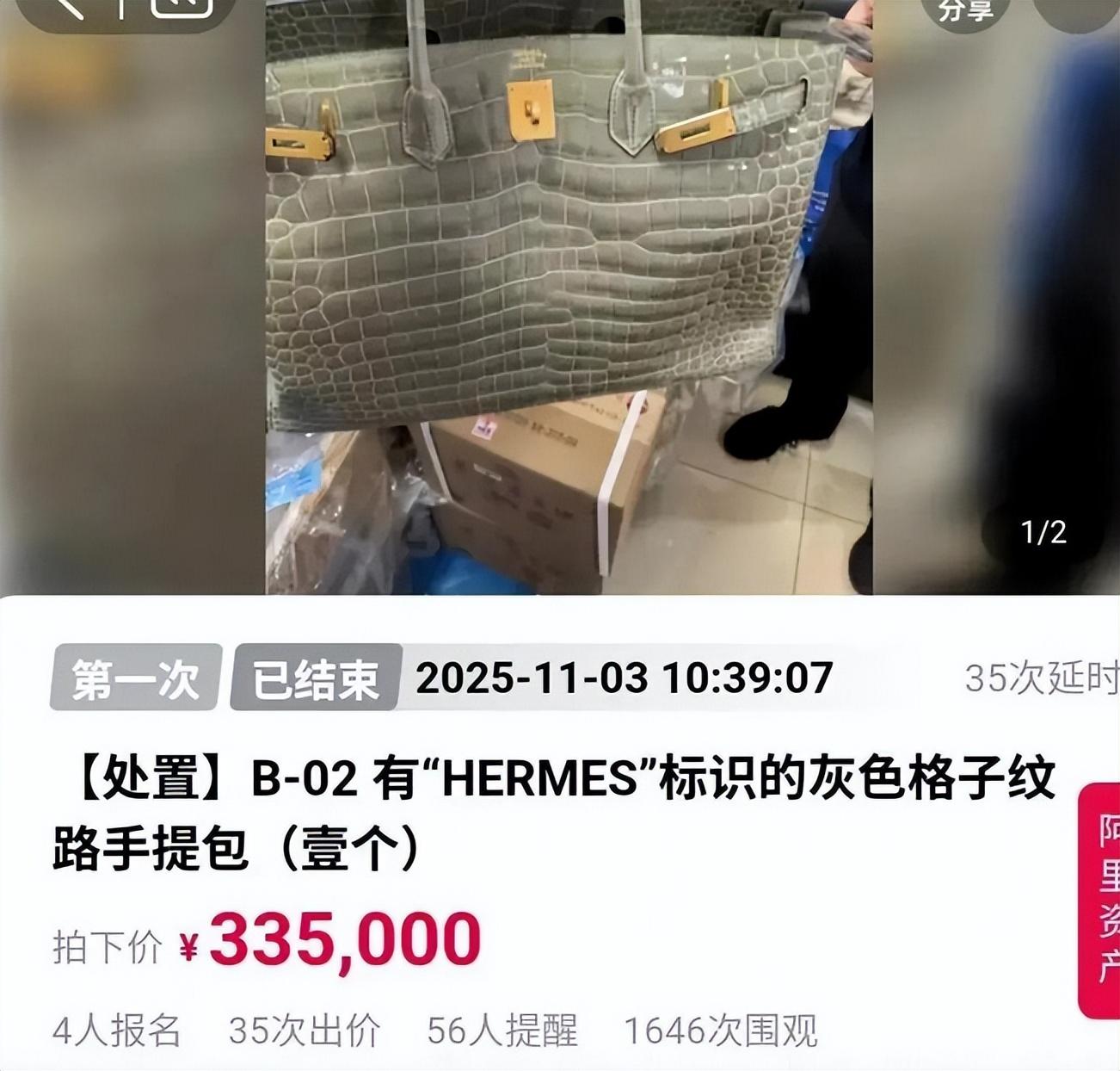 此外,還有大量箱包,這些箱包都是LV、GUCCI、香奈兒等奢侈品品牌,其中一款HERMES灰色格子紋路手提包,成交價爲33.5萬元。