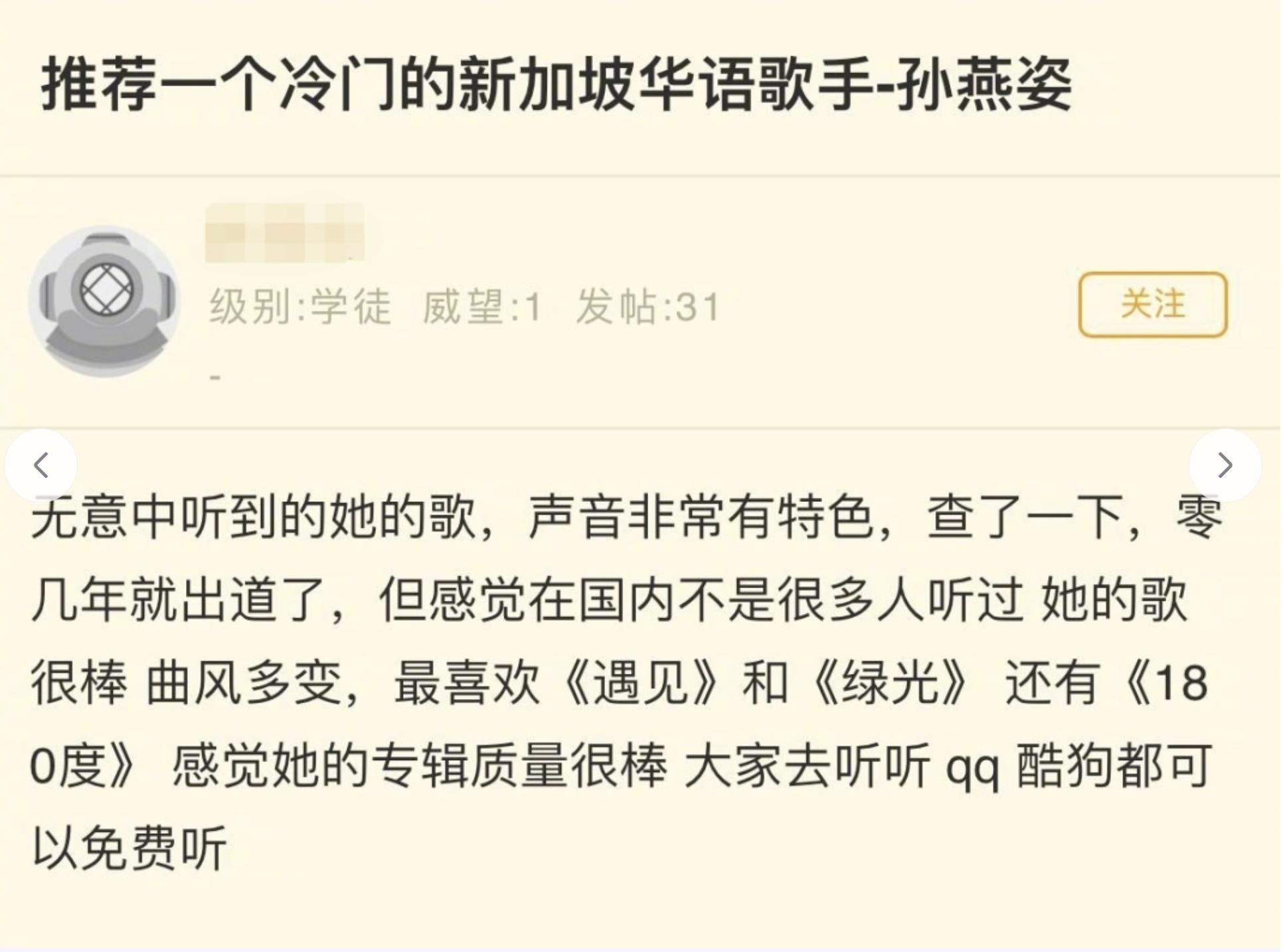 只是人們還不知道,孫燕姿是新加坡華人,因爲發唱片不得不背井離鄉。