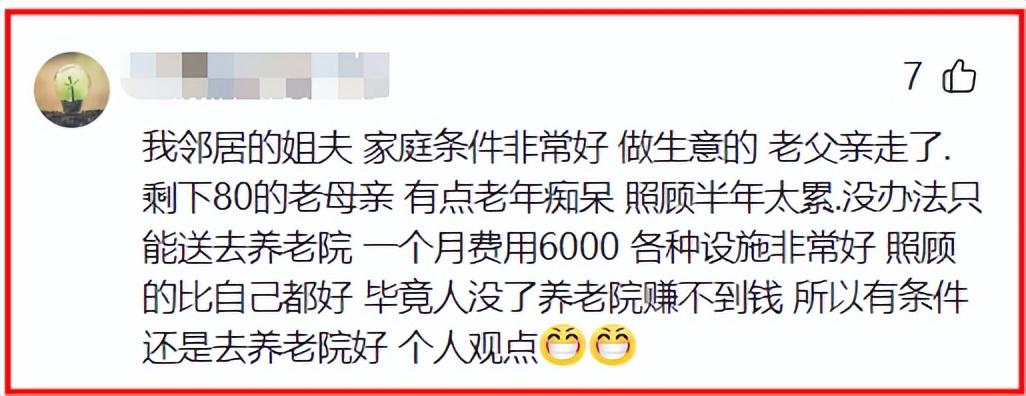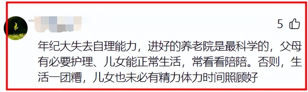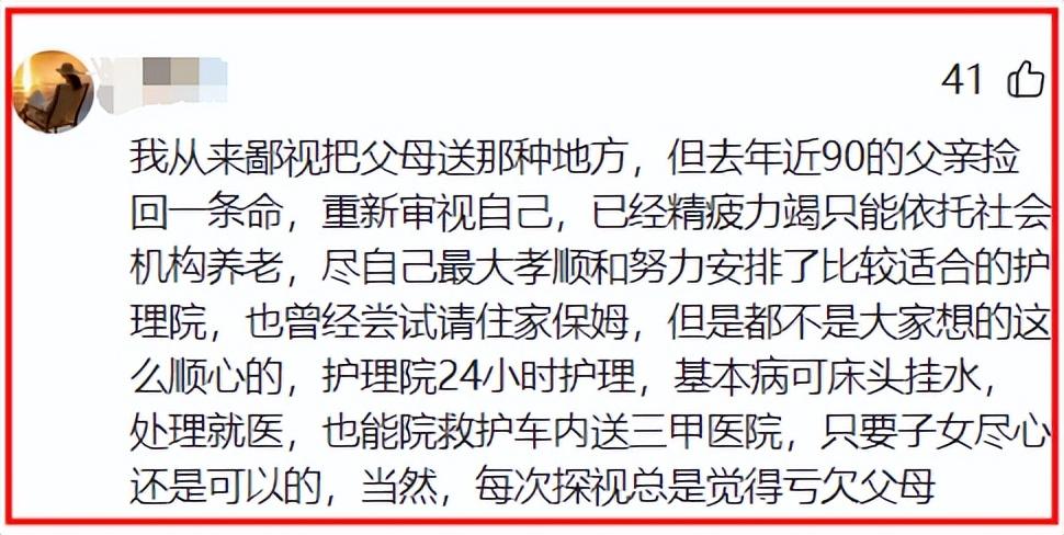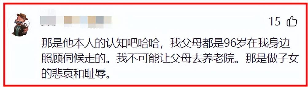 有網友說他的父母都是96歲在他身邊,由他照顧伺候走的。該網友直言他不可能讓父母去養老院,該網友認爲這樣做是做子女的悲哀和恥辱。