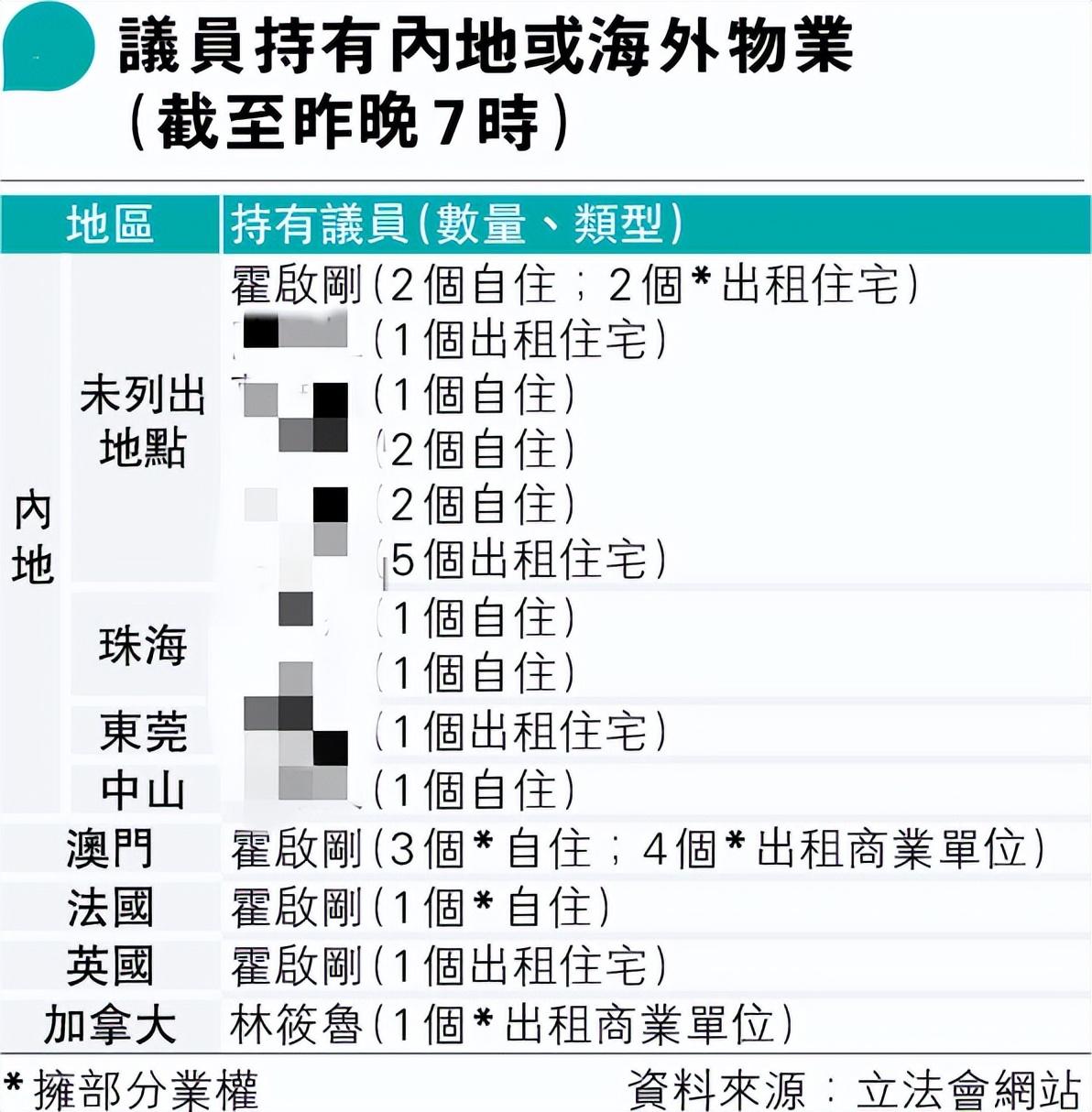 港媒對此進行了綜合梳理。通過梳理發現,議員中霍啓剛名下物業最多,他持有35項物業,其中7個物業自用,28個物業出租。