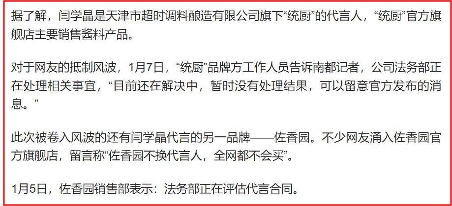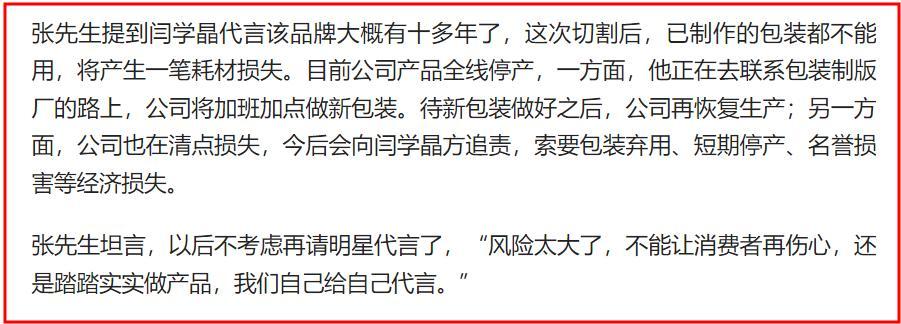 該品牌的負責人張先生對媒體說公司已經作出與閆學晶切割的決策,將來不再使用閆學晶的形象在產品包裝上。