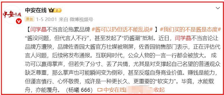 如今哭窮事件發酵成這般地步,是閆學晶危機公關失敗的原因,也是她飄了、忘本的原因。這怪不了別人,都是她咎由自取。