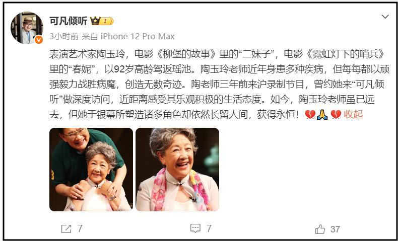到了晚上,又傳來了著名錶演藝術家陶玉玲去世的消息。