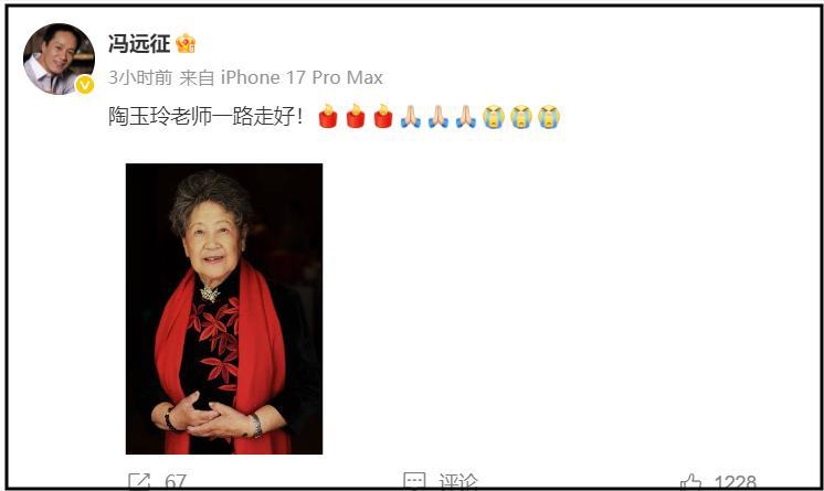 陶玉玲去世的消息最早由馮遠征透露,他在社交賬號發文悼念陶玉玲。