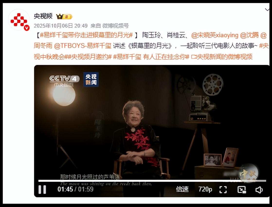 在網絡公開查詢可以發現,陶玉玲最後一次公開亮相是在去年10月6日,她當時亮相總檯中秋晚會,和肖桂雲、沈騰、易烊千璽等人一起講述電影人的故事。