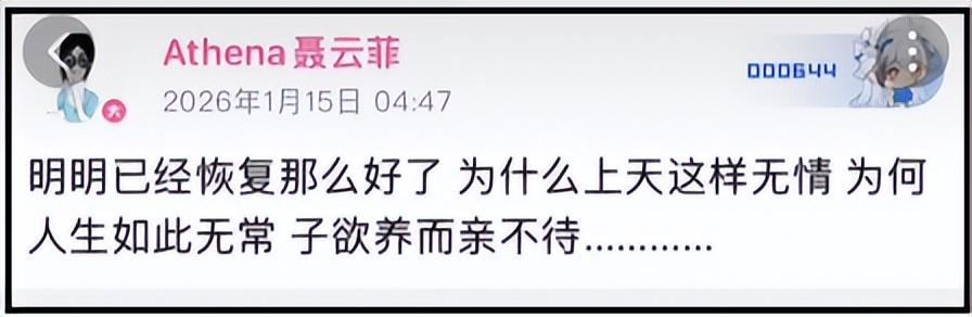 聶衛平離世後,他的女兒聶雲菲發文“明明已經恢復那麼好了,爲什麼上天這樣無情,爲何人生如此無常,子欲養而親不待…”
