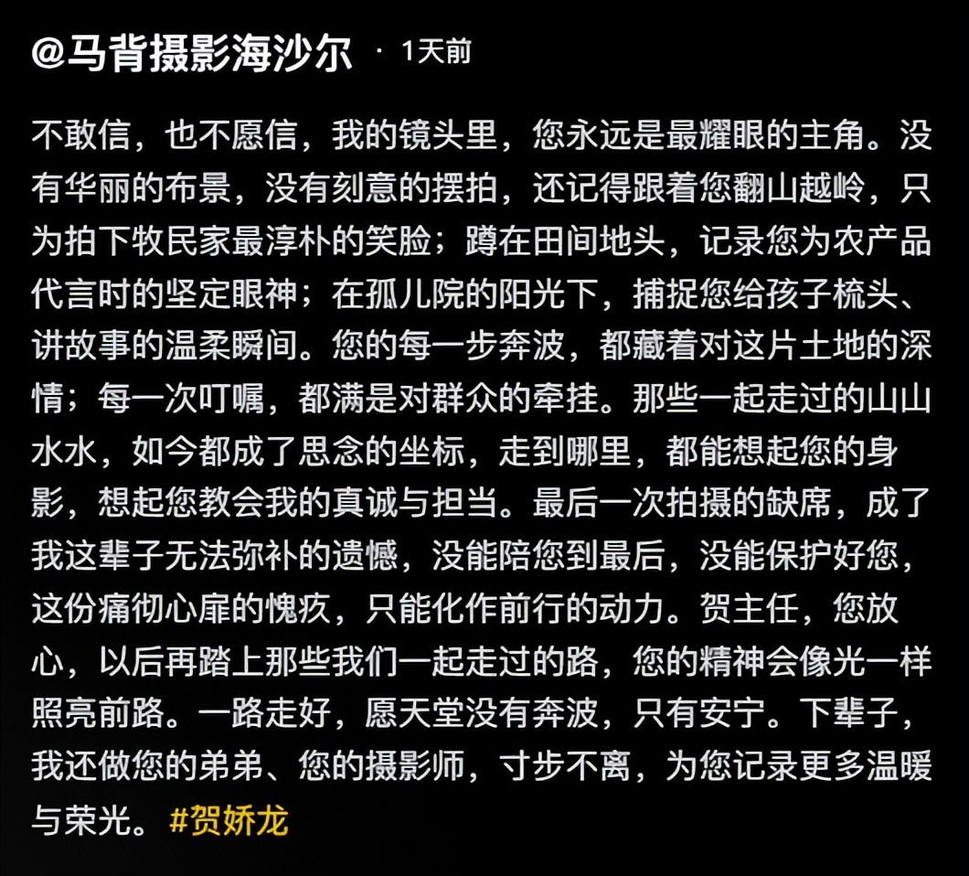 如今賀嬌龍離世,海沙爾也發文悼念了。海沙爾直言“最後一次拍攝的缺席,成了我這輩子無法彌補的遺憾。”