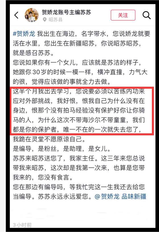 根據蘇蘇發佈的長文可知,往常賀嬌龍拍攝視頻,她都會陪在她身邊,但這一次,因爲出門學習,她沒有陪着賀嬌龍。