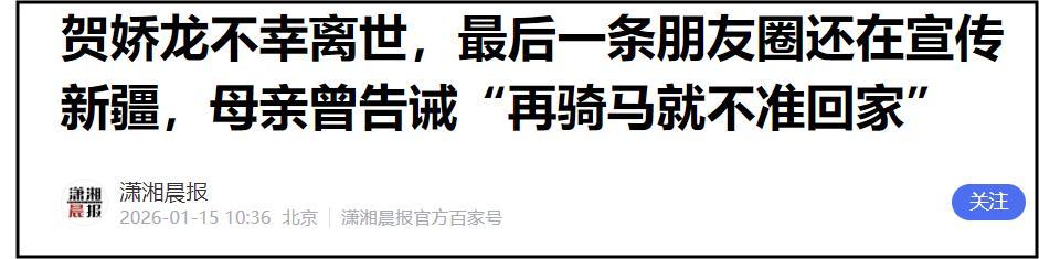 1月14日上午,網絡瘋傳賀嬌龍因墜馬傷重去世。