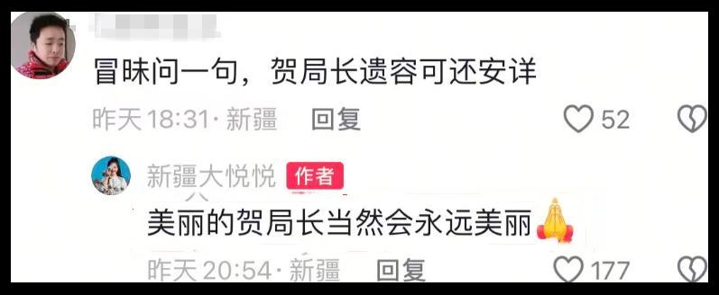 賀嬌龍的朋友大悅悅透露,在火化前,賀嬌龍遺容安詳,彷彿是睡着的睡美人。
