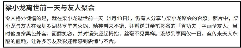 值得一提的是,在去世前一天,梁小龍看起來好好的,並沒有什麼異樣。
