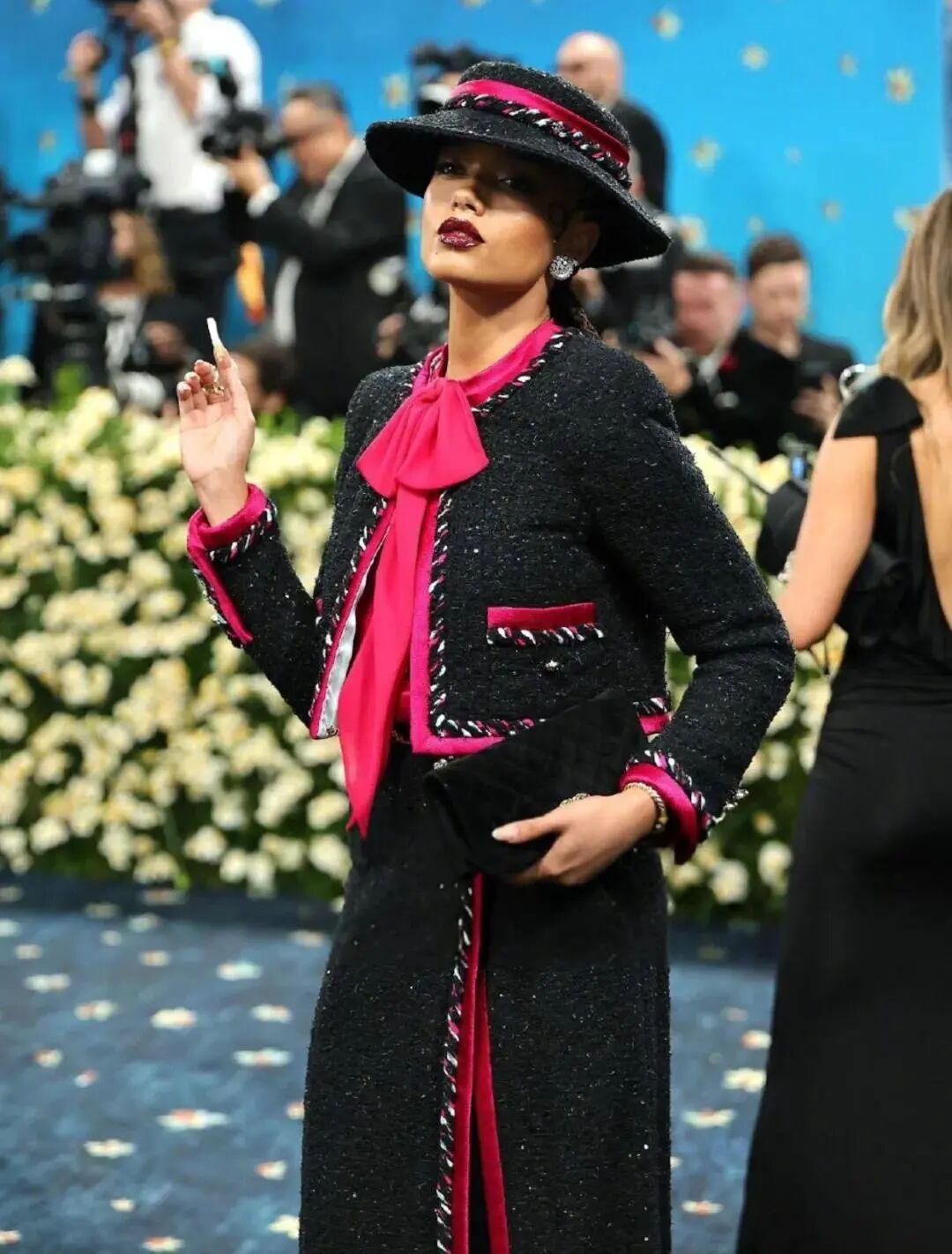 去年Met Gala紅毯上,她以香奈兒標誌性“小香風”黑色套裝亮相,直接化身香奈兒女士本人。