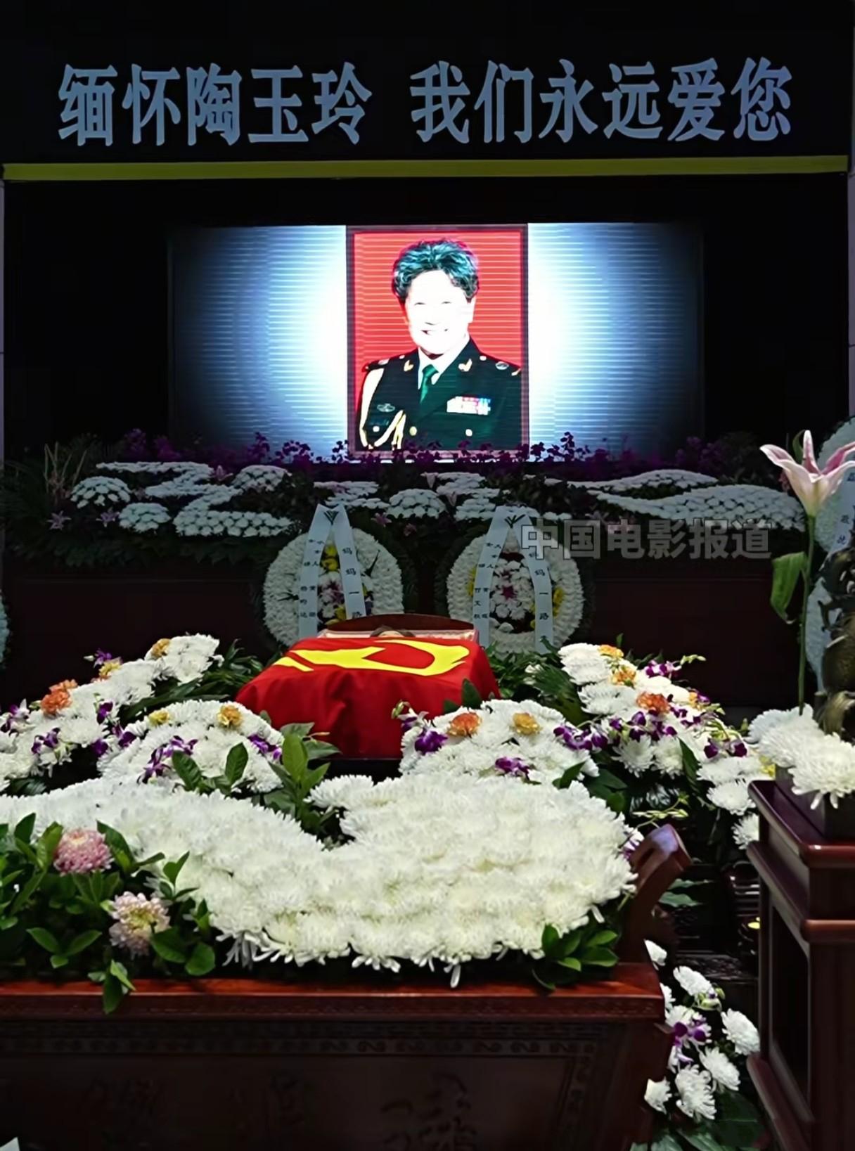 在靈堂的正前方的最中間可以看到陶玉玲的遺像。遺像的選擇很講究,並不是一張普通的個人照,而是一張軍裝照。