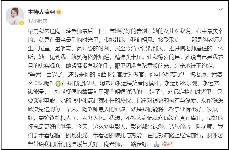 在告別儀式結束後,藍羽發了一篇長文悼念陶玉玲。