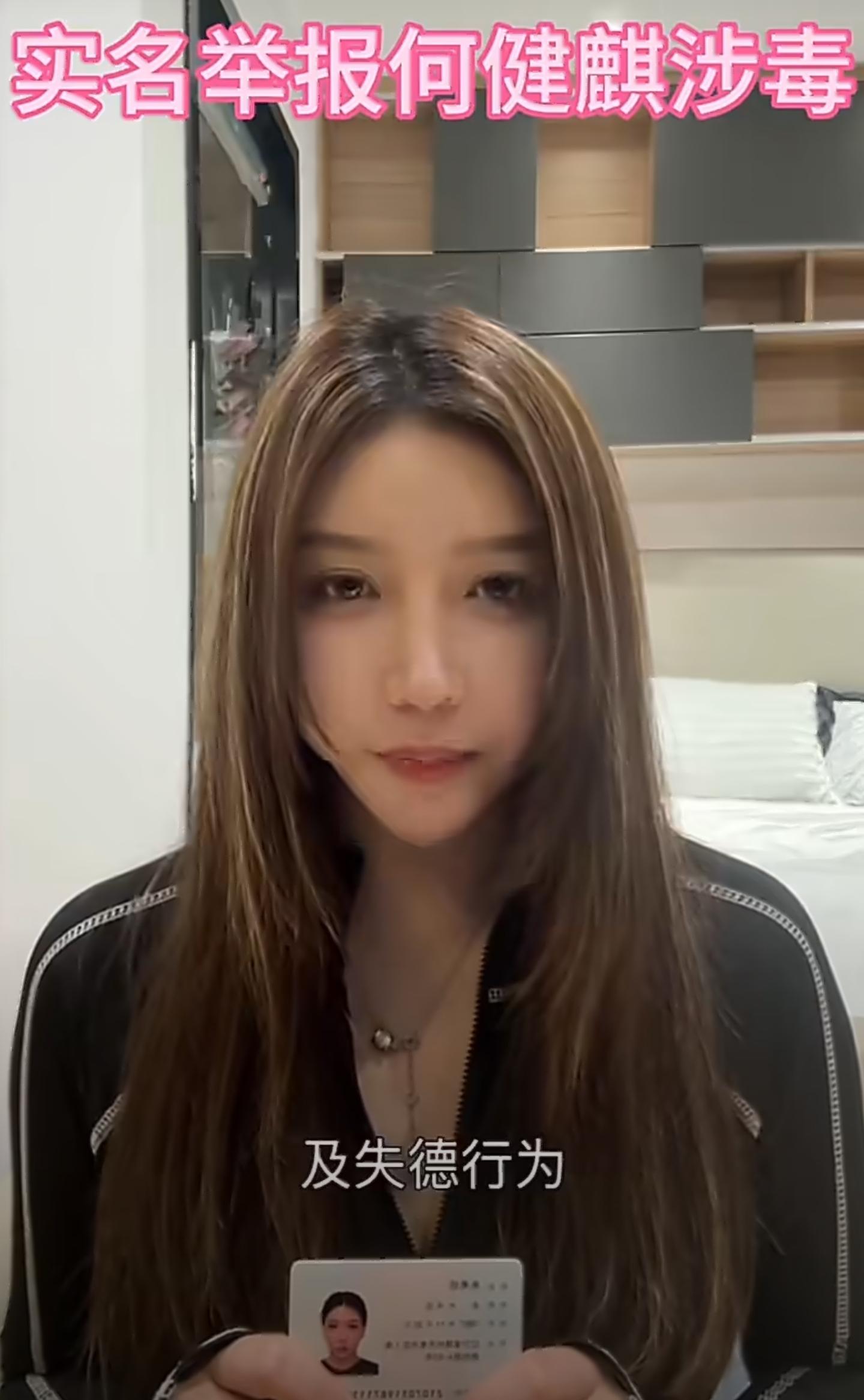 從舉報視頻中可以看到,朱女士顏值姣好,她手持身份證列數何健麒的罪狀。