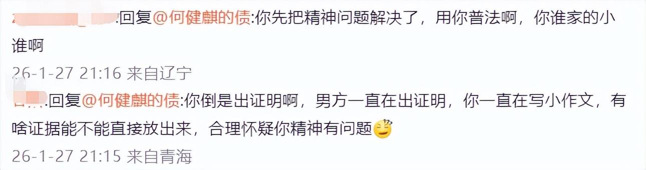 何健麒的粉絲紛紛湧入朱女士的賬號,如果只是就事論事的討論此事也沒什麼,但他們瘋狂辱罵朱女士是精神病。