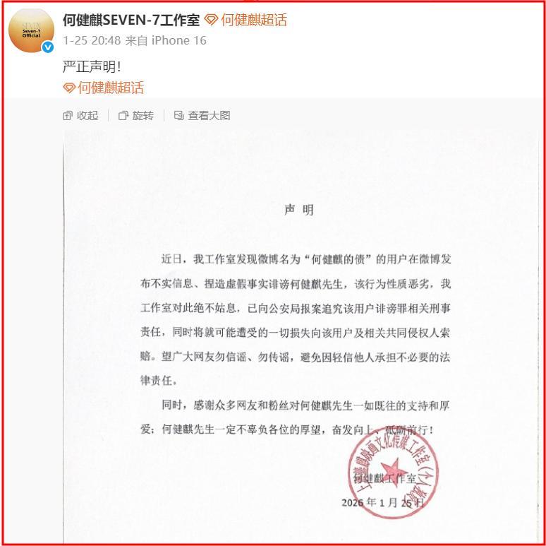何健麒工作室表示對此絕不姑息,已向公安機關報案。
