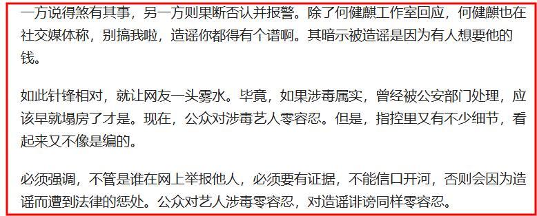 極目新聞在評論文章中稱“何健麒涉毒的瓜非同小可,這不是八卦花邊。何健麒有沒有因爲涉毒被警方帶走調查,事實並不難查清。對此,不能任由他們兩人在網上互撕,應該給出權威的結論。”