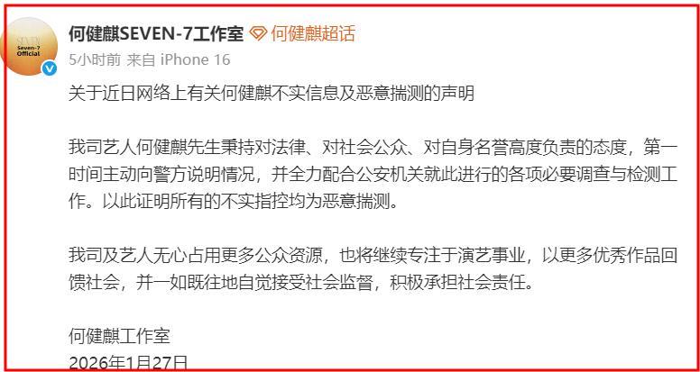 1月27日,何健麒工作室曬出了何健麒從1995年到2026年之間的無犯罪記錄證明。