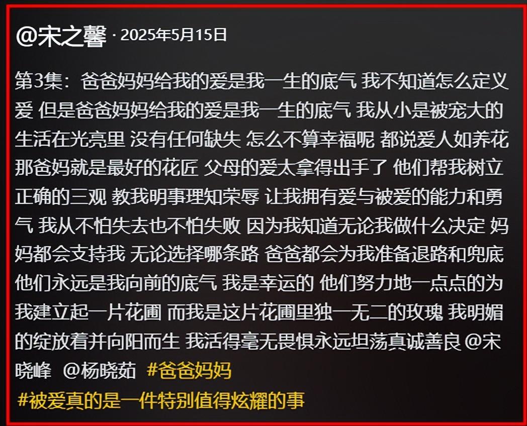作爲父親,得知爆料內容,相信宋曉峯也會好好教育引導孩子,避免孩子犯下更大的錯誤。從這2年,宋之馨發佈的動態看,她似乎已經懂得了感恩,知道了父母的不易。